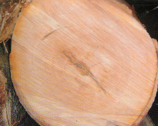 心邊材區(qū)別不明顯。木材淺粉紅褐色至紅褐色。生長輪略可見,不均勻。