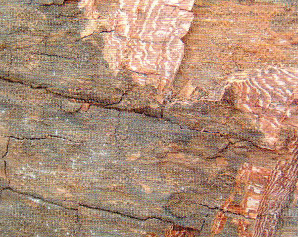 厚約0.5 cm,質(zhì)硬脆,易塊狀剝離外皮灰黑色,具不規(guī)則淺龜裂,易小片狀脫落。內(nèi)皮紫紅色,斷面見(jiàn)白色弦向帶、斜削面呈紫白相間的斑馬紋,為其主要的識(shí)別特征。