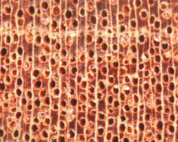 散禮材。管孔肉眼下明顯,略多,大小中等;單管孔;部分斜列;侵填體豐富,軸向蒲壁組織放大鏡下可見,環(huán)管束狀或近翼狀。本射線肉眼下略見。略密,略寬。軸向樹膠道內眼下明顯,長弦列白色點狀。